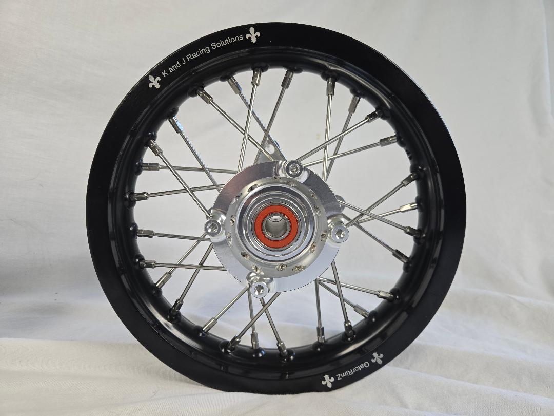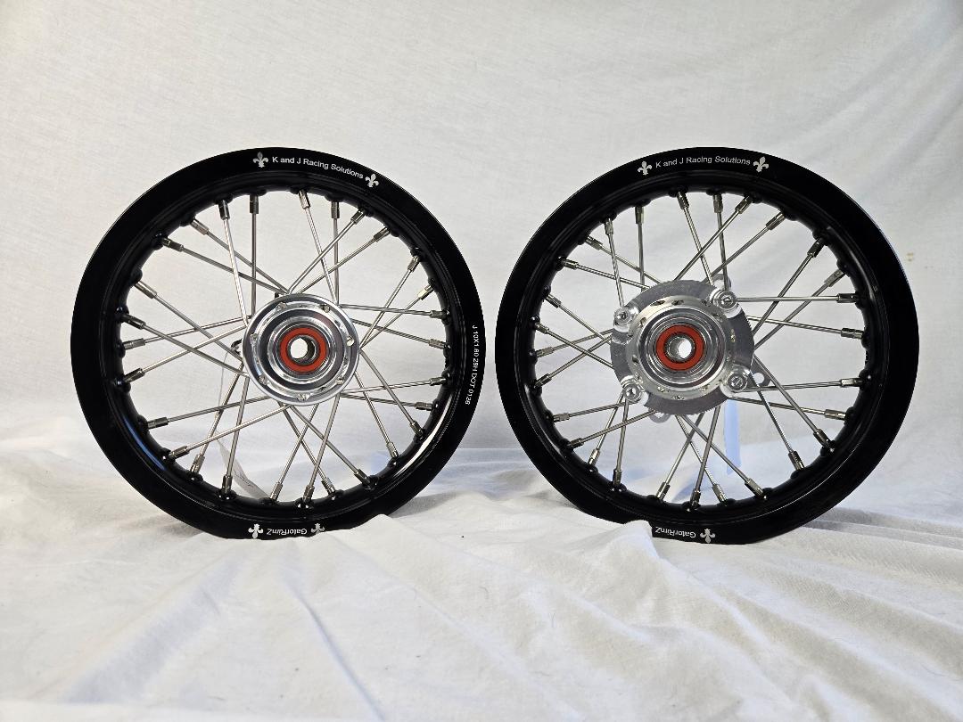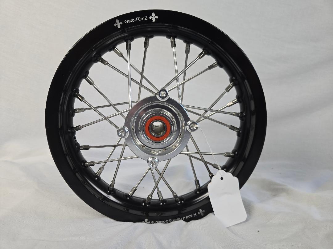 GatorRimZ KTM50, 10″ x 1.60″ 28-hole black aluminum anodized rims with Tusk orange aftermarket hubs and spacers. Wheels include stainless steel spokes and nipples from Buchanan’s Spoke and Rim. Price includes free UPS Ground shipping. 2024 forward wheels are built on SILVER Tusk hubs.