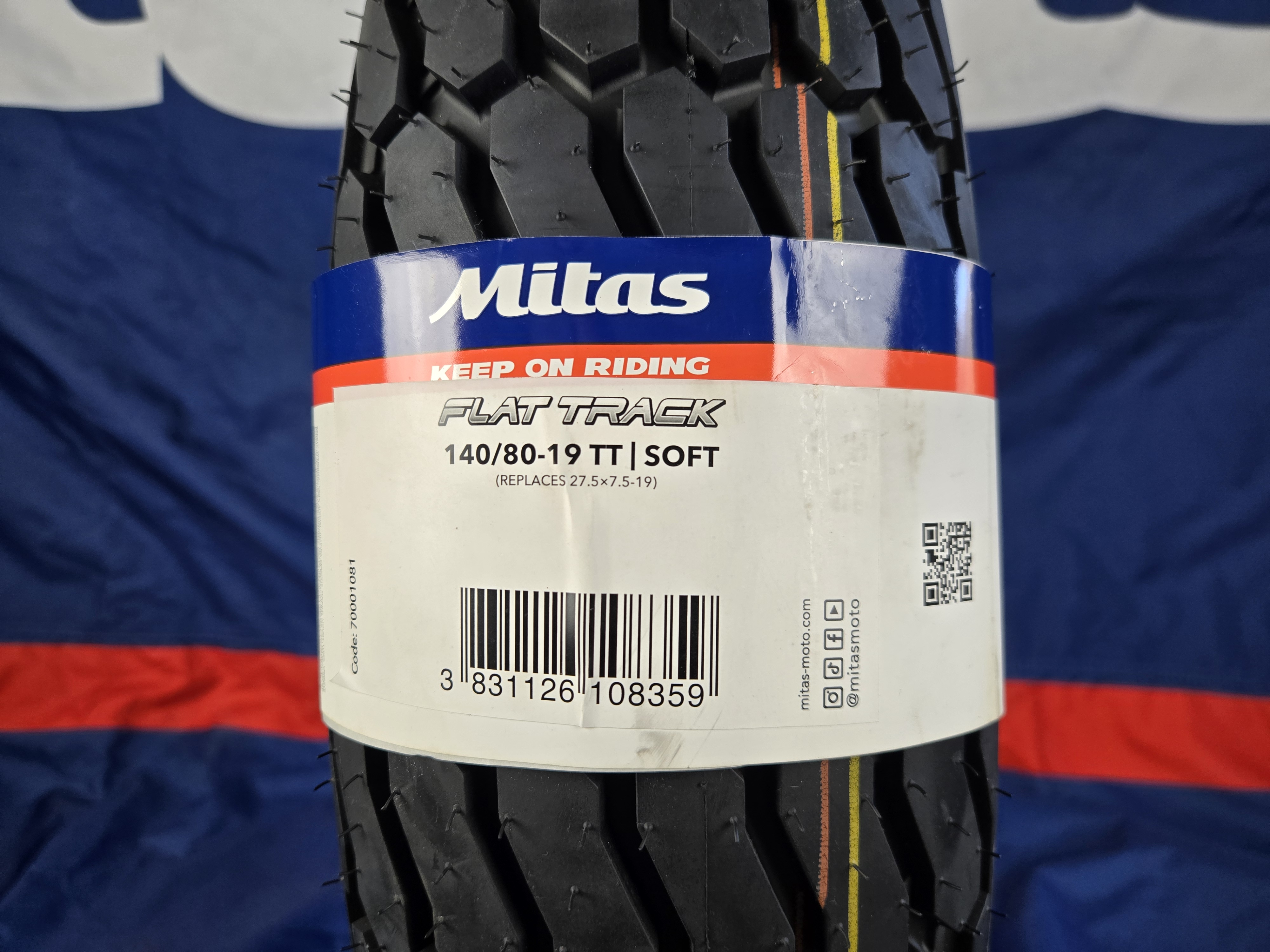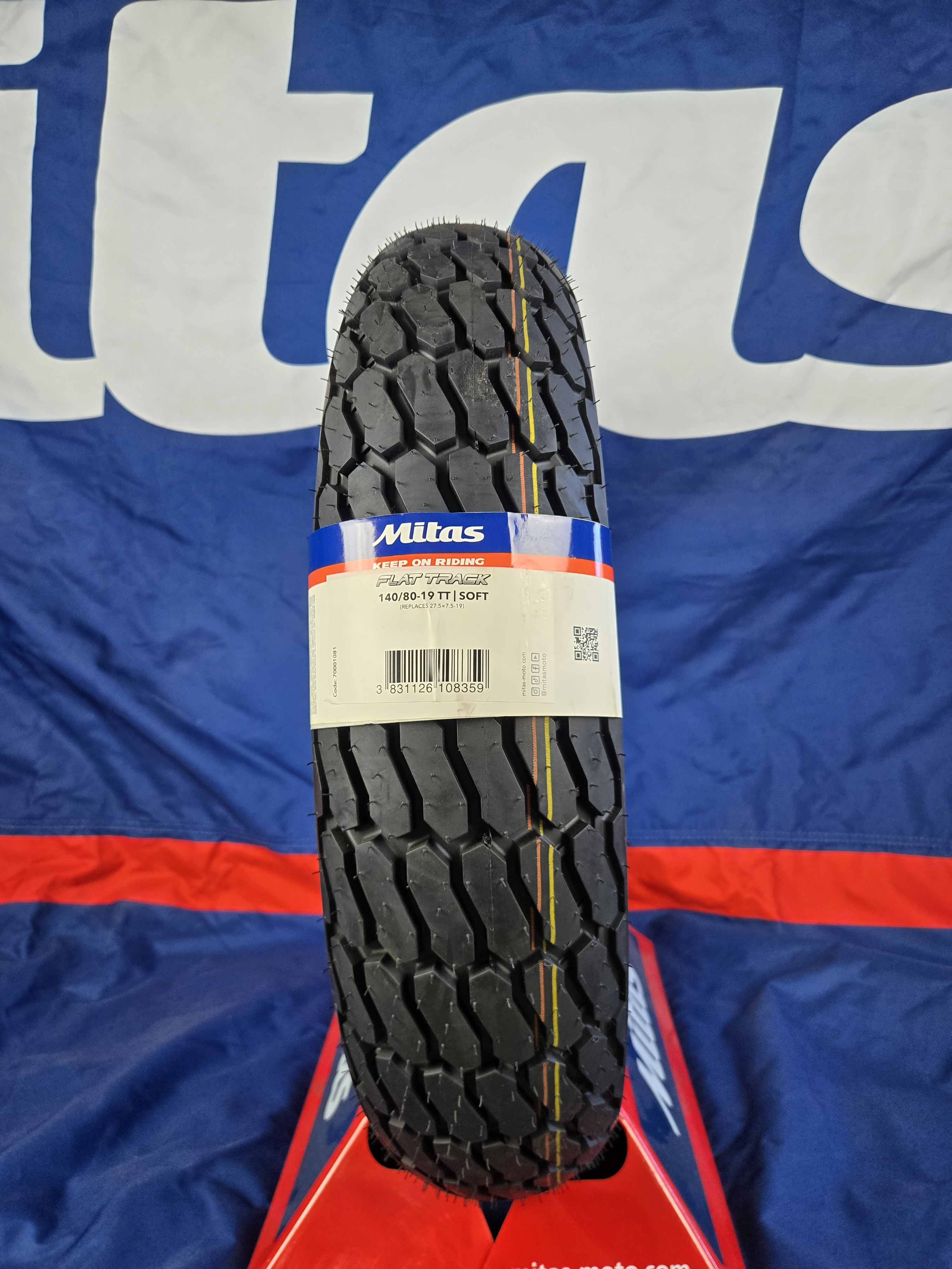 Mitas FT-18 Dirt Track Tire 27.5 x 7.5-19 Flat Track Rear Race tire, soft compound. Red and gold stripe. New generation of flat track tires with bigger knobs and improved grip in the corners.