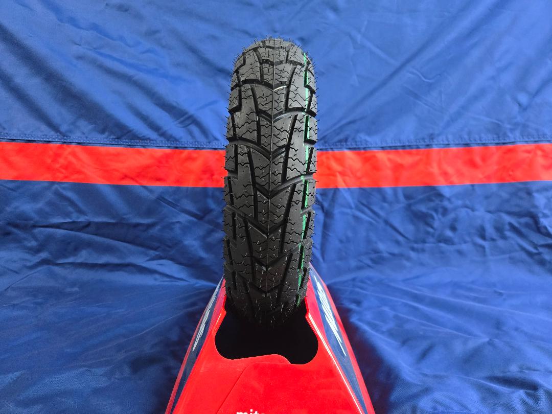 Mitas MC32 Win Scoot in a 3.50-10 inch size. Mitas’s winter scooter tire has different depth grooves for water and slush ejection. Even though this tire is a winter tire, it is popular with flat track racers.